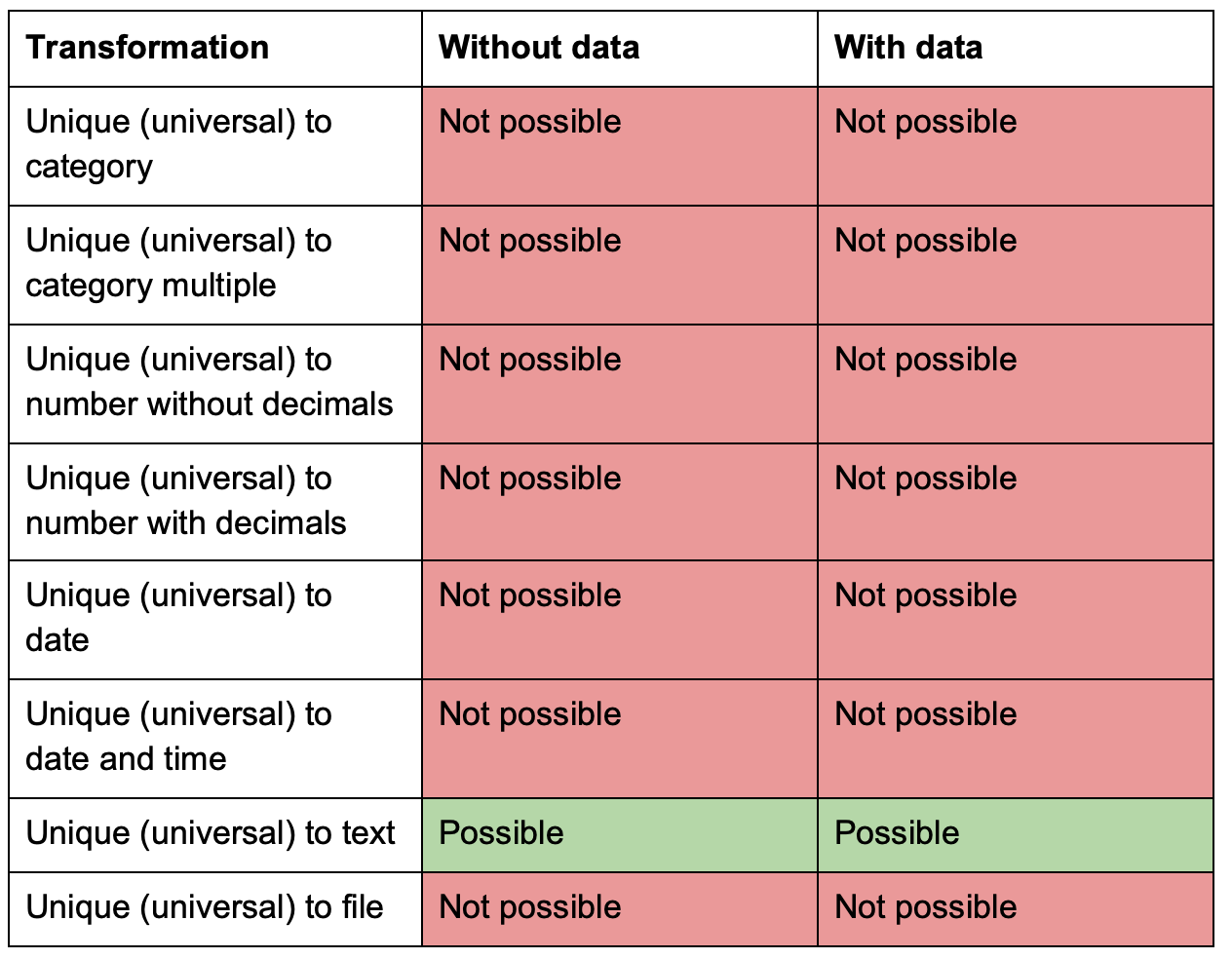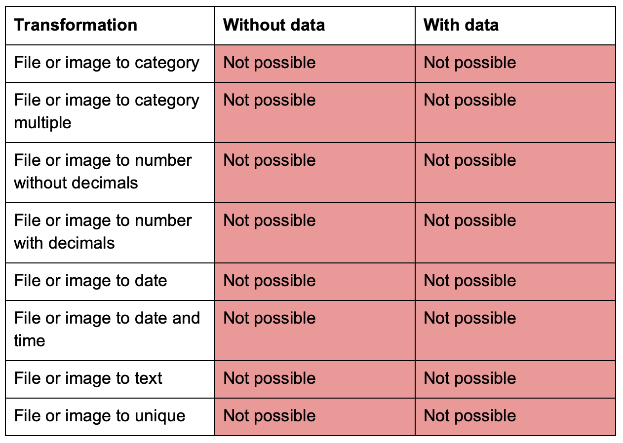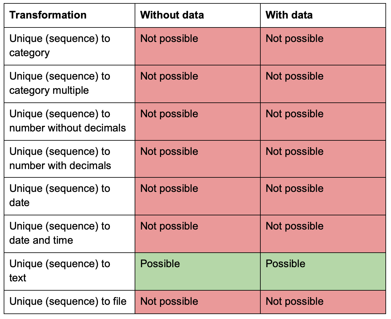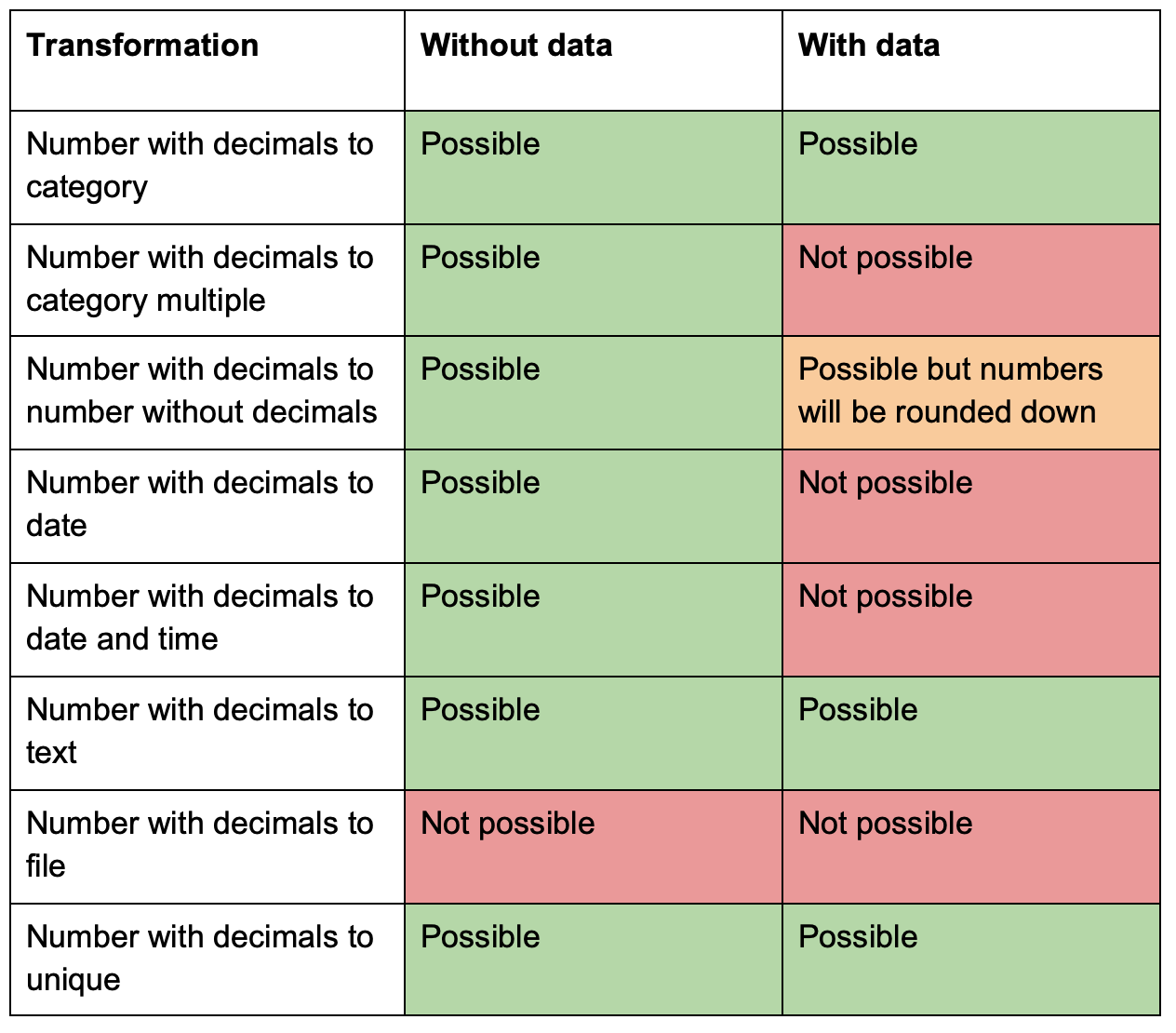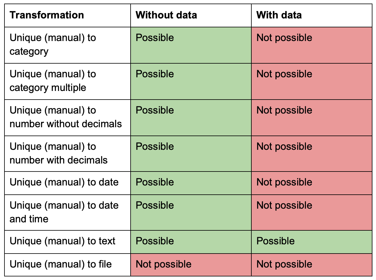 You can edit almost all information in a variable, but there are some restrictions on editing the data type in cases where alterations will conflict with already defined setups in your project; see possible/impossible data type change in the tables below. Note that the data type of variables that are used as part of calculations can not be altered.