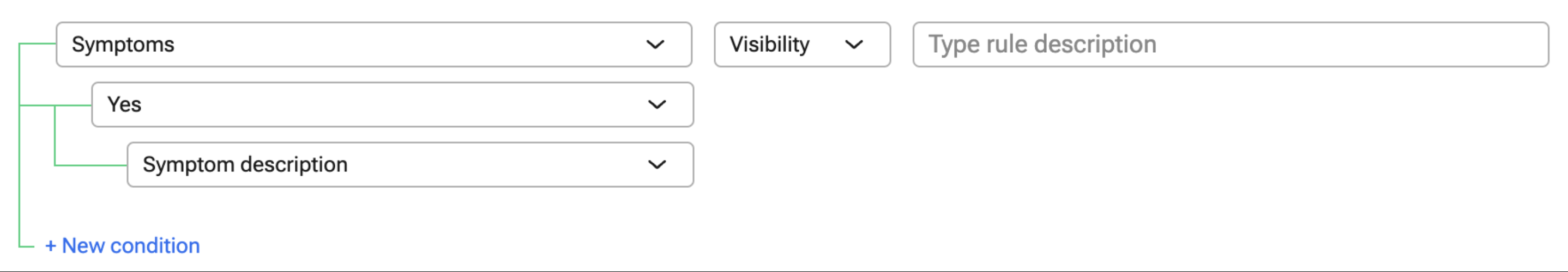 For example, if you have created a category variable called “Symptoms” with the values “Yes” and “No”, and another variable called “Symptom description”, you can use visibility to only show the “Symptom description” variable when “Yes” is chosen in “Symptoms”. Only the condition to show the variable (in this case, “Yes”) needs to be defined, as the other option (“No”) will automatically hide the variable. In this example, “Symptoms” is the initiating variable, and “Symptom description” is the dependent variable.