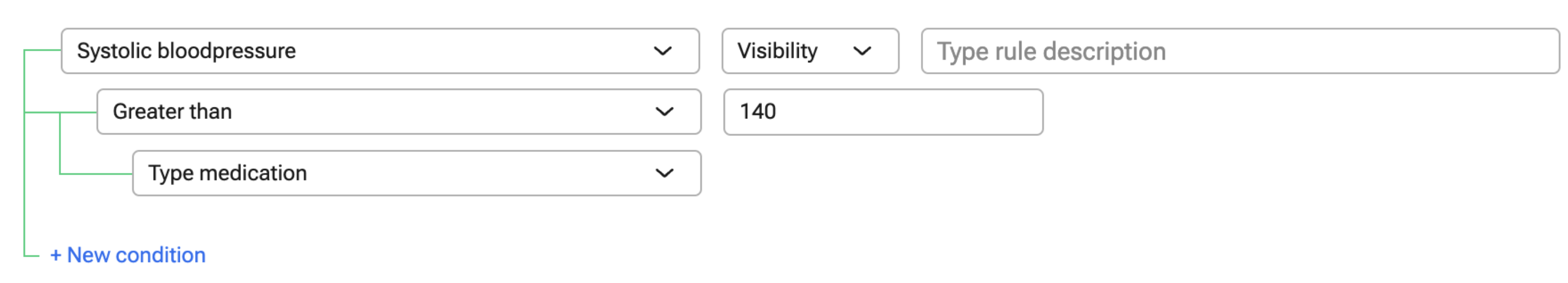 You can also use a numeric variable as an initiating variable. For example, suppose the initiating variable is “Systolic blood pressure” and the dependent variable is “Type of antihypertensive medication”. In that case, the latter should only be shown if the systolic blood pressure is higher than 140 mmHg.