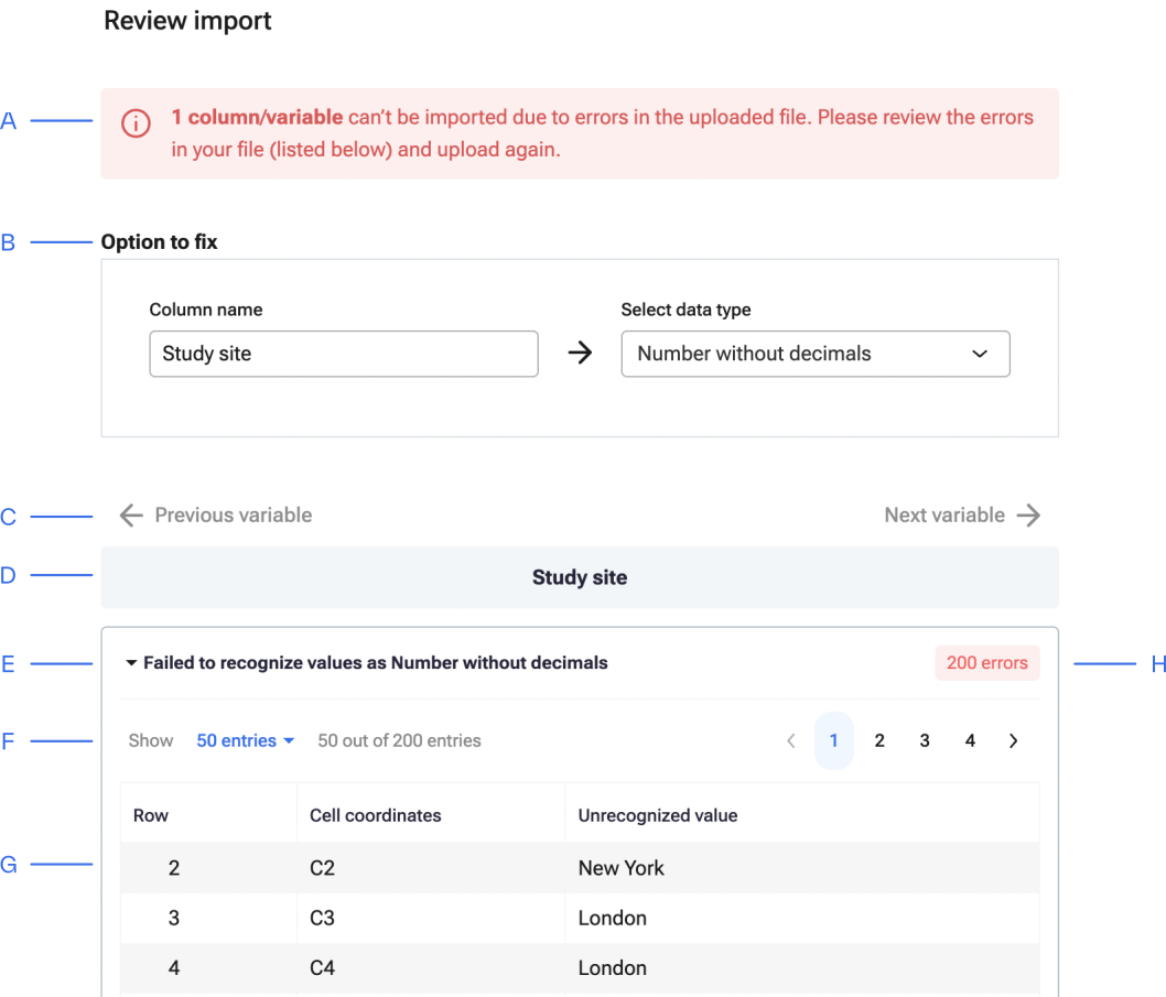 - If there are any errors in your file, they will be pointed out in the next step. Ledidi will highlight the variable(s) and cell(s) causing the issue. It will also provide you with the option to change the datatype. See below for an example of an error message.