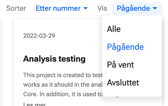 - Velg om du vil vise "Alle", "Pågående", "På vent" eller "Avsluttet" prosjekter.