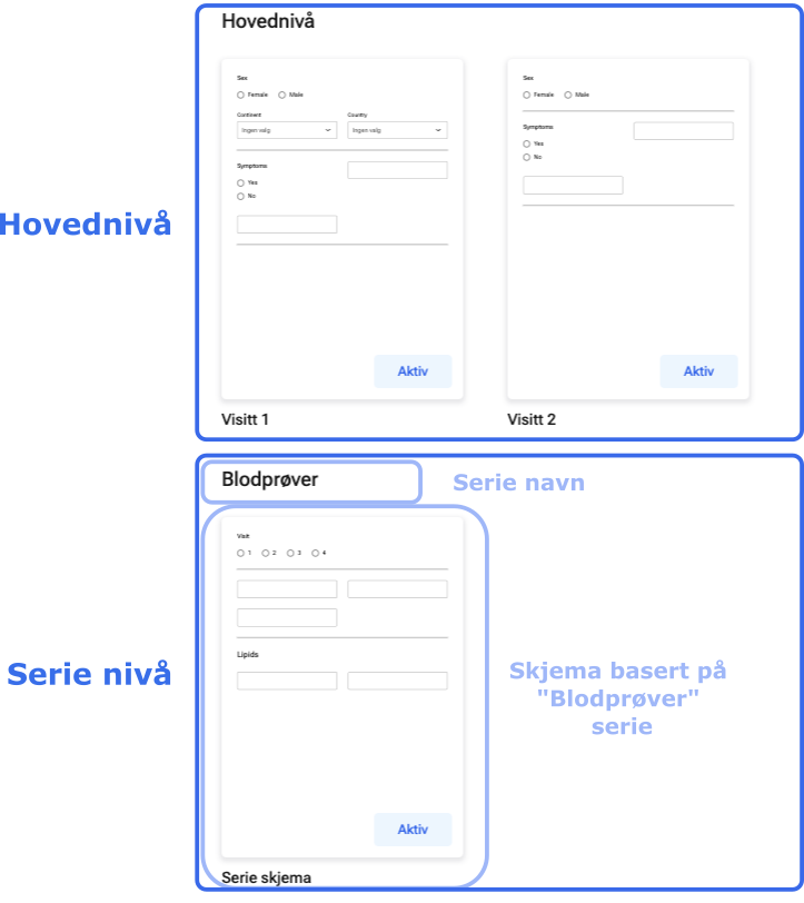 Eksempel: Du har en serie kalt "blodprøver" som inneholder 100 forskjellige blodparametere (100 variabler). Avhengig av studievisitt ønsker du å inkludere ulike parametere ved hvert visitt (f.eks. 100 ved baselinebesøket, 50 ved besøk 2 og 30 ved besøk 3). I dette tilfellet vil det være nyttig å tilpasse serien slik at du kan velge hvilke parametere som skal inkluderes ved hvert visitt. Opprett tre skjemaer basert på serien «Blodprøver», og legg til de aktuelle variablene i hvert skjema. Når du legger inn data i serien, vil alle tre skjemaene vises øverst på skjermen.