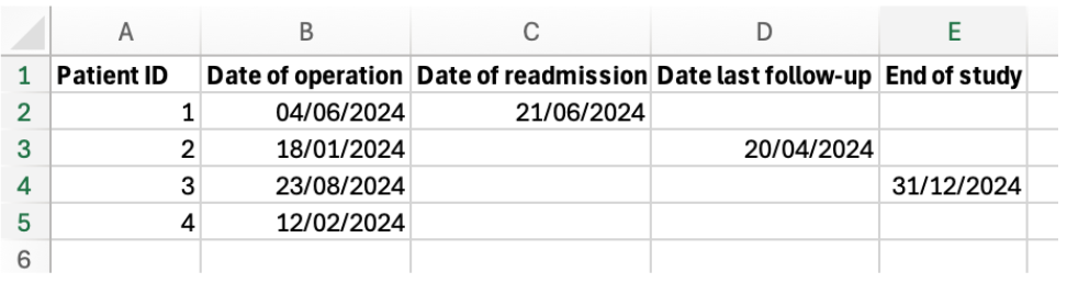 Pasient 4: Kun startdato er fylt ut, men alle andre variabler er tomme, og det er ikke definert noen sluttdato for sensurering. Denne pasienten vil bli sensurert.