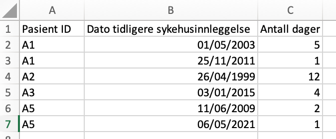 Eksempel: Kolonnen "Patient ID" brukes til å matche oppføringer på serienivå med riktig oppføring på hovednivå. Pasientene A1 og A5 har to oppføringer på serienivå hver, og har derfor data i to rader.