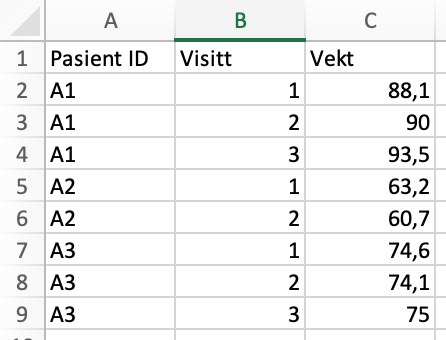 Eksempel: Kolonnen "Patient ID" er nødvendig for å matche oppføringen på serienivå med riktig oppføring på hovednivå. Siden serien allerede inneholder oppføringer som vi ønsker å legge til flere data i, er kolonnen "Visit" nødvendig. I dette tilfellet vil vektvariabelen bli lagt til i riktig serieoppføring. Legg merke til at hver serieoppføring vises i en egen rad i importfilen.